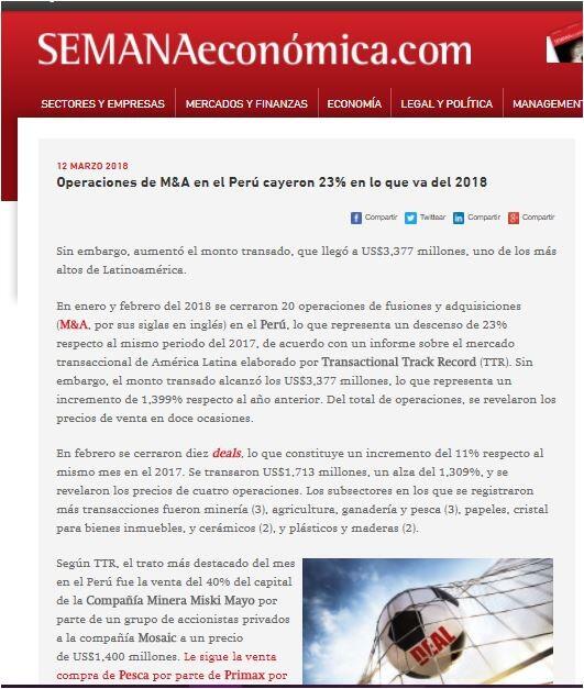 Según TTR, el trato más destacado del mes en el Perú fue la venta del 40% del capital de la Compañía Minera Miski Mayo por parte de un grupo de accionistas privados a la compañía Mosaic a un precio de US$1,400 millones. Le sigue la venta compra de Pesca por parte de Primax por un valor de US$273 millones, la compra de Sancela Perú, adquirida por el Grupo Familia a US$37 millones, y Agrícola José Juan, vendido por Inversiones Costa Verde Perú a Agroindustrias AIB por US$2 millones.