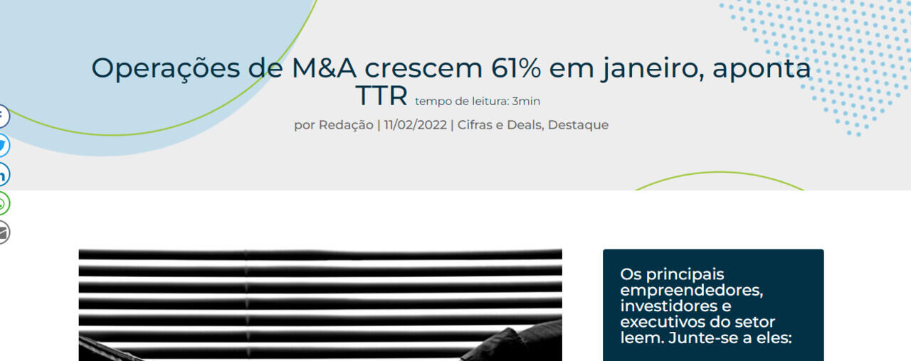 Comparado ao mesmo mês de 2021, a quantidade de transações de M&A cresceu 61%. Quatro (42%) em cada dez deals possuem os valores revelados, e 73% das operações já estão concluídas, aponta o TTR.
