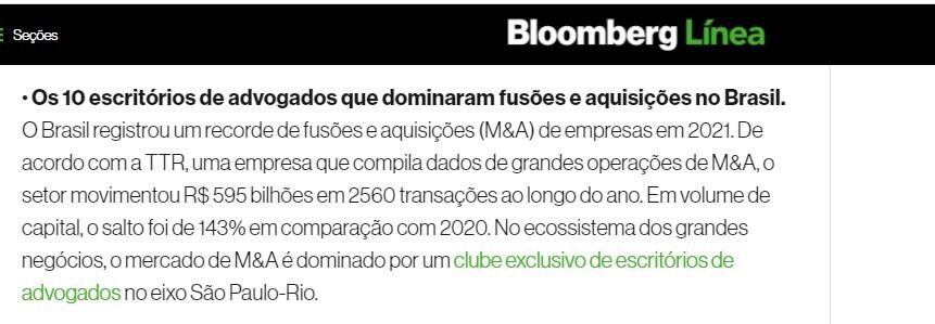 O Brasil registrou um recorde de fusões e aquisições (M&A) de empresas em 2021. De acordo com a TTR, uma empresa que compila dados de grandes operações de M&A, o setor movimentou R$ 595 bilhões em 2560 transações ao longo do ano. Em volume de capital, o salto foi de 143% em comparação com 2020. No ecossistema dos grandes negócios, o mercado de M&A é dominado por um clube exclusivo de escritórios de advogados no eixo São Paulo-Rio.