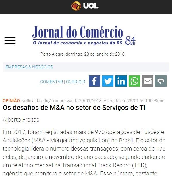 Em 2017, foram registradas mais de 970 operações de Fusões e Aquisições (M&A - Merger and Acquisition) no Brasil. E o setor de tecnologia lidera o número dessas transações, com cerca de 170 delas, de janeiro a novembro do ano passado, segundo dados de um relatório mensal da Transactional Track Record (TTR), agência que monitora o setor de M&A. Esse número, bastante significativo, representa uma mudança no paradigma econômico do nosso País, afinal o mercado nacional de fusões e aquisições no segmento de TI tem se mostrado cada vez mais maduro, e já é referência em transações entre fornecedoras de ERPs, e até potenciais unicórnios da próxima geração de startups.