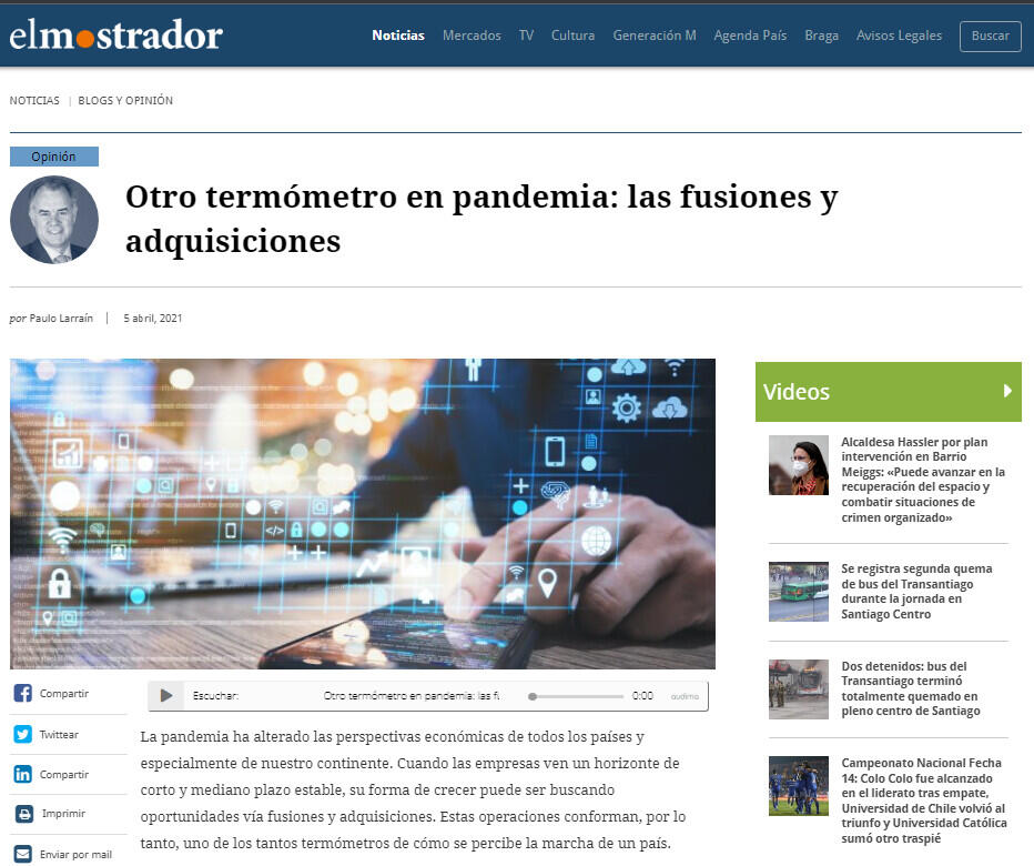 La pandemia ha alterado las perspectivas económicas de todos los países y especialmente de nuestro continente. Cuando las empresas ven un horizonte de corto y mediano plazo estable, su forma de crecer puede ser buscando oportunidades vía fusiones y adquisiciones. Estas operaciones conforman, por lo tanto, uno de los tantos termómetros de cómo se percibe la marcha de un país.