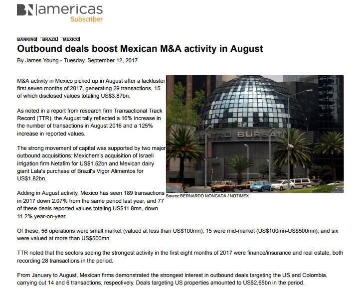 - M&A activity in Mexico picked up in August after a lackluster first seven months of 2017, generating 29 transactions, 15 of which disclosed values totaling US$3.87bn.