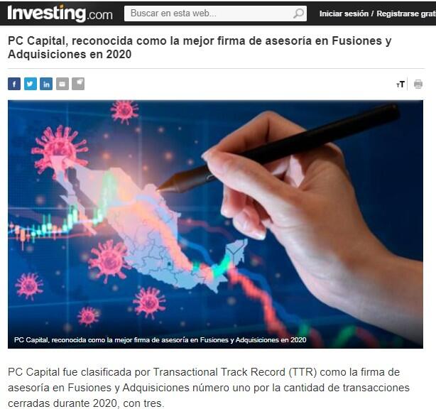 PC Capital fue clasificada por Transactional Track Record (TTR) como la firma de asesoría en Fusiones y Adquisiciones número uno por la cantidad de transacciones cerradas durante 2020, con tres.