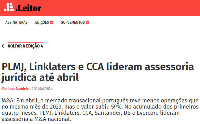 M&A: Em abril, o mercado transacional português teve menos operações que no mesmo mês de 2023, mas o valor subiu 59%. No acumulado dos primeiros quatro meses, PLMJ, Linklaters, CCA, Santander, DB e Evercore lideram assessoria a M&A nacional.