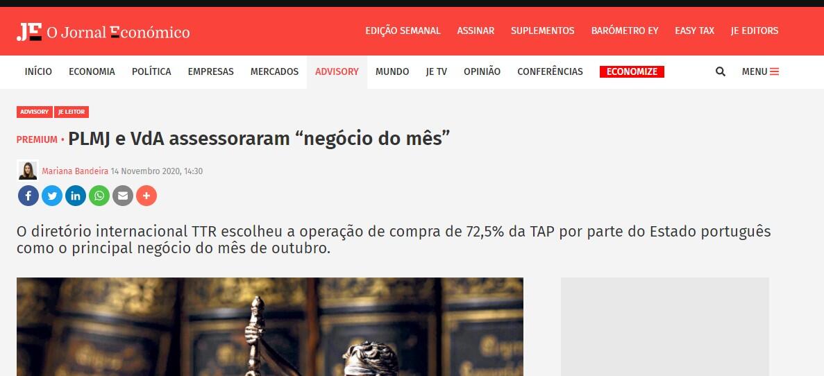 As sociedades de advogados PLMJ e Vieira de Almeida (VdA) assessoram juridicamente a aquisição de 72,5% da TAP por parte do Estado, uma operação que foi escolhida pelo diretório internacional Transactional Track Record (TTR) como o negócio do mês de outubro de Portugal (“Deal of The Month”).