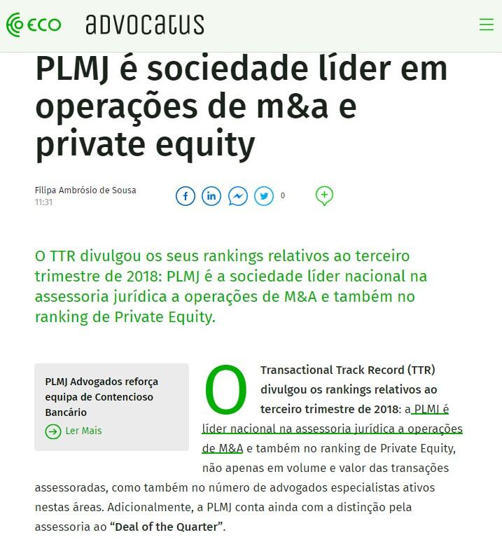 Transactional Track Record (TTR) divulgou os rankings relativos ao terceiro trimestre de 2018: a PLMJ é líder nacional na assessoria jurídica a operações de M&A e também no ranking de Private Equity, não apenas em volume e valor das transações assessoradas, como também no número de advogados especialistas ativos nestas áreas. Adicionalmente, a PLMJ conta ainda com a distinção pela assessoria ao “Deal of the Quarter”.