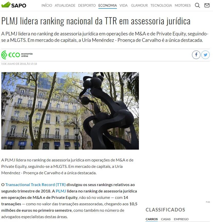 O Transactional Track Record (TTR) divulgou os seus rankings relativos ao segundo trimestre de 2018. A PLMJ lidera no ranking de assessoria jurídica em operações de M&A e de Private Equity, não só no volume — com 14 transações — como no valor das transações assessoradas, chegando aos 10,5 milhões de euros no primeiro semestre, como também no número de advogados especialistas destas áreas.