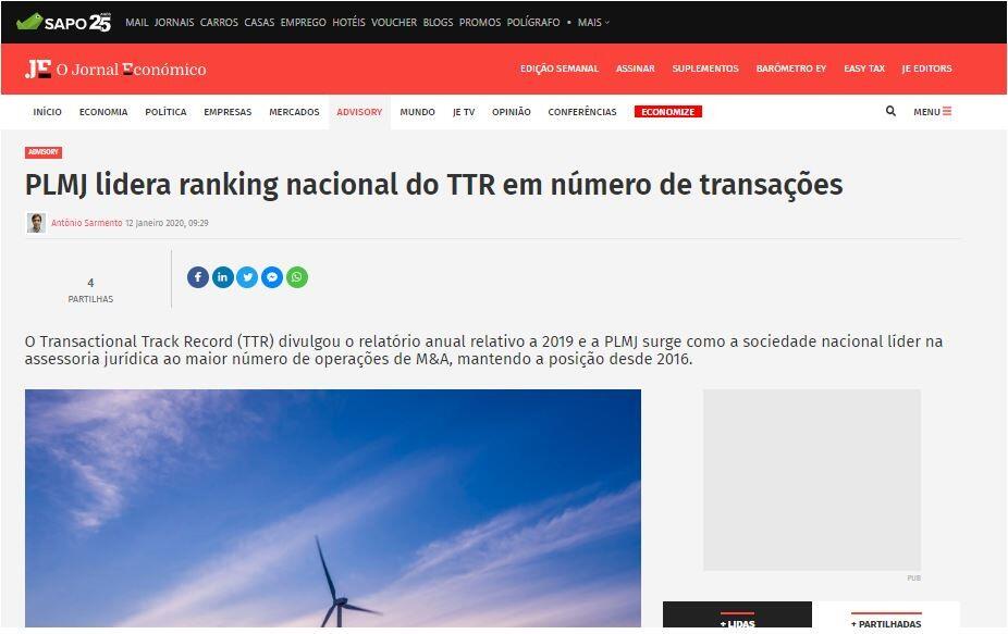 O Transactional Track Record (TTR) divulgou o relatório anual relativo a 2019 e a PLMJ surge como a sociedade nacional líder na assessoria jurídica ao maior número de operações de M&A, mantendo a posição desde 2016.
