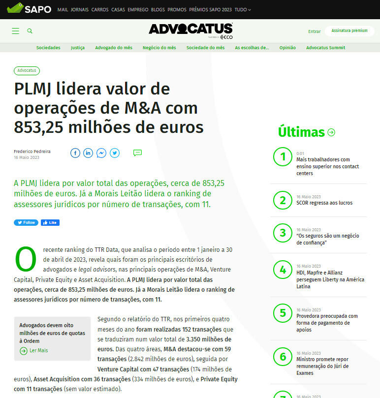 O recente ranking do TTR Data, que analisa o período entre 1 janeiro a 30 de abril de 2023, revela quais foram os principais escritórios de advogados e legal advisors, nas principais operações de M&A, Venture Capital, Private Equity e Asset Acquisition. A PLMJ lidera por valor total das operações, cerca de 853,25 milhões de euros. Já a Morais Leitão lidera o ranking de assessores jurídicos por número de transações, com 11.