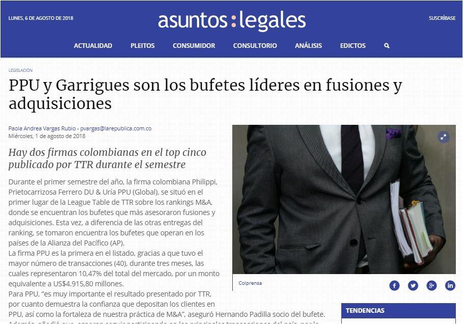 Durante el primer semestre del año, la firma colombiana Philippi, Prietocarrizosa Ferrero DU & Uría PPU (Global), se situó en el primer lugar de la League Table de TTR sobre los rankings M&A, donde se encuentran los bufetes que más asesoraron fusiones y adquisiciones. Esta vez, a diferencia de las otras entregas del ranking, se tomaron encuentra los bufetes que operan en los países de la Alianza del Pacífico (AP).