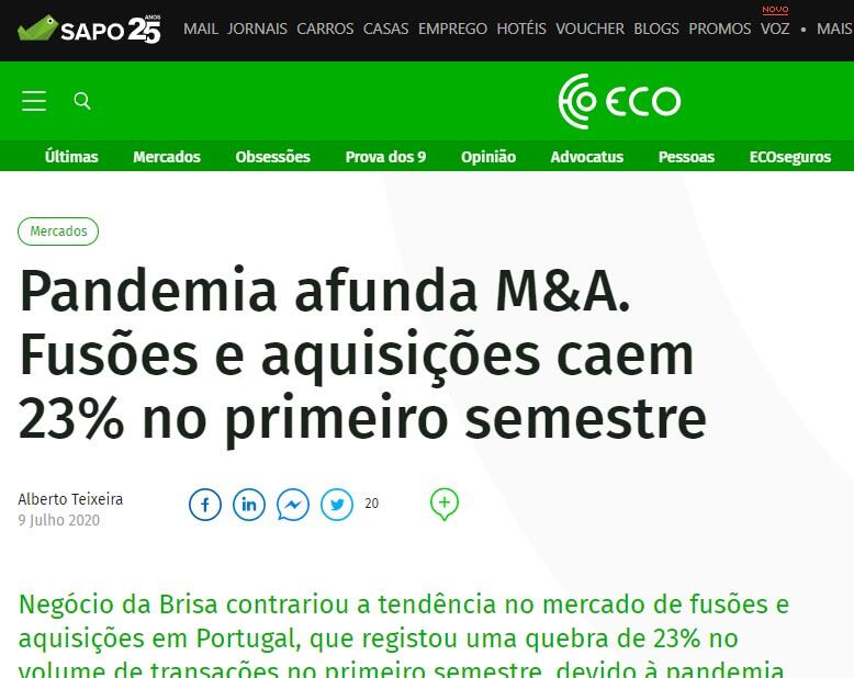 O número de operações representa uma redução de 23% em relação ao primeiro semestre de 2019, isto apesar de o valor total ter disparado 47% graças à venda da Brisa a um consórcio de investidores internacionais, num negócio avaliado em mais de 2,4 mil milhões de euros.