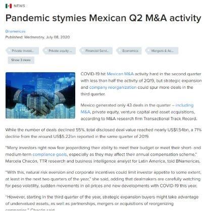 COVID-19 hit Mexican M&A activity hard in the second quarter with less than half the activity of 2Q19, but strategic expansion and company reorganization could spur more deals in the third quarter.