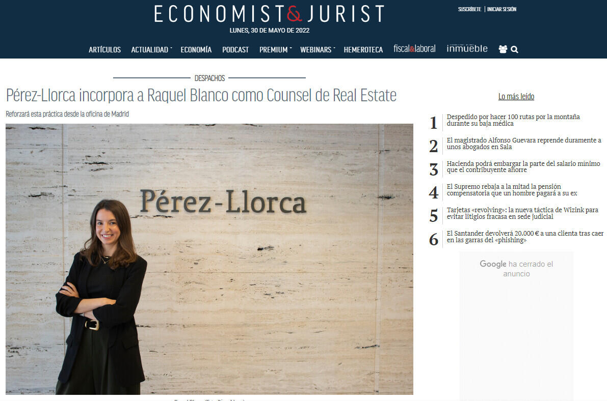 Pérez-Llorca ha anunciado hoy la incorporación de Raquel Blanco como Counsel de Real Estate en la oficina de Madrid. Blanco reforzará esta área de práctica que está reconocida como una de las mejores de España según los directorios internacionales Chambers & Partners (Banda 1) y Legal 500 (Tier 1).