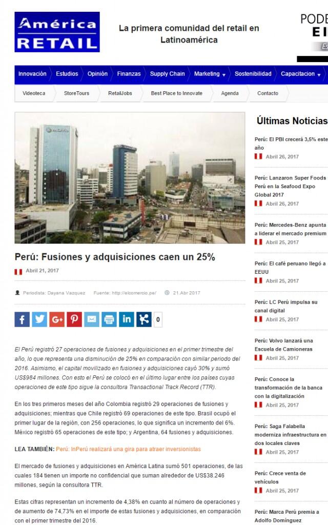 El Perú registró 27 operaciones de fusiones y adquisiciones en el primer trimestre del año, lo que representa una disminución de 25% en comparación con similar periodo del 2016. Asimismo, el capital movilizado en fusiones y adquisiciones cayó 30% y sumó US$984 millones. Con esto el Perú se colocó en el último lugar entre los países cuyas operaciones de este tipo sigue la consultora Transactional Track Record (TTR).