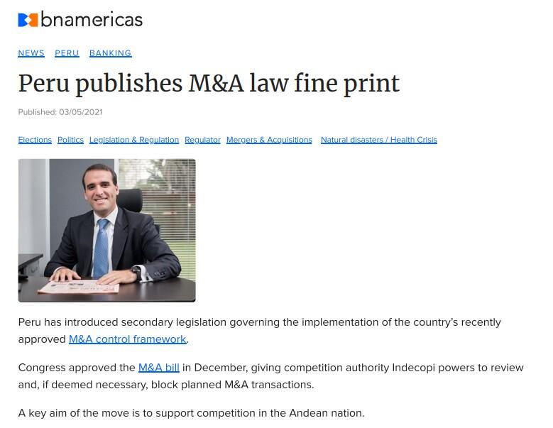 Congress approved the M&A bill in December, giving competition authority Indecopi powers to review and, if deemed necessary, block planned M&A transactions. A key aim of the move is to support competition in the Andean nation.