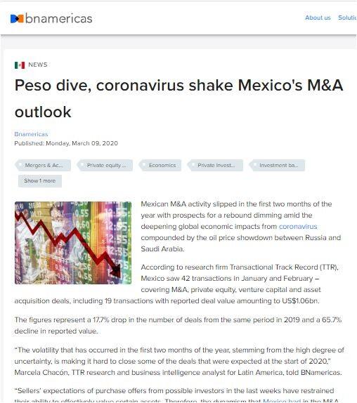 "If the current environment continues, created by the constant devaluation [sic] of the Mexican peso, the sudden shocks in oil prices, as well as the uncertainty generated by coronavirus, this could represent another challenge for 2020 in the Mexican M&A market.”
