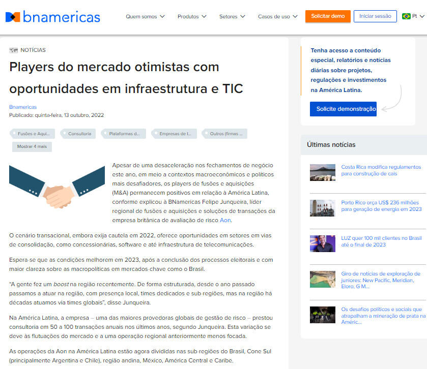 Apesar de uma desaceleração nos fechamentos de negócio este ano, em meio a contextos macroeconômicos e políticos mais desafiadores, os players de fusões e aquisições (M&A) permanecem positivos em relação à América Latina, conforme explicou à BNamericas Felipe Junqueira, líder regional de fusões e aquisições e soluções de transações da empresa britânica de avaliação de risco Aon.