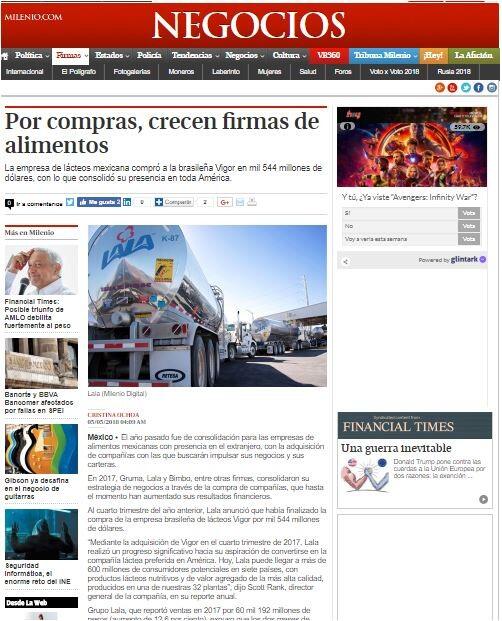 “Mediante la adquisición de Vigor en el cuarto trimestre de 2017, Lala realizó un progreso significativo hacia su aspiración de convertirse en la compañía láctea preferida en América. Hoy, Lala puede llegar a más de 600 millones de consumidores potenciales en siete países, con productos lácteos nutritivos y de valor agregado de la más alta calidad, producidos en una de nuestras 32 plantas”, dijo Scott Rank, director general de la compañía, en su reporte anual.