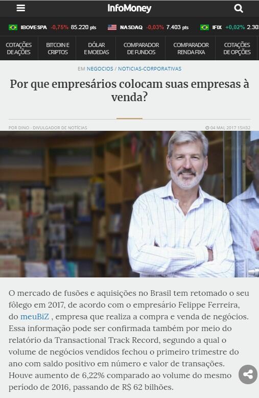O mercado de fusões e aquisições no Brasil tem retomado o seu fôlego em 2017, de acordo com o empresário Felippe Ferreira, do meuBiZ , empresa que realiza a compra e venda de negócios. Essa informação pode ser confirmada também por meio do relatório da Transactional Track Record, segundo a qual o volume de negócios vendidos fechou o primeiro trimestre do ano com saldo positivo em número e valor de transações. Houve aumento de 6,22% comparado ao volume do mesmo período de 2016, passando de R$ 62 bilhões.