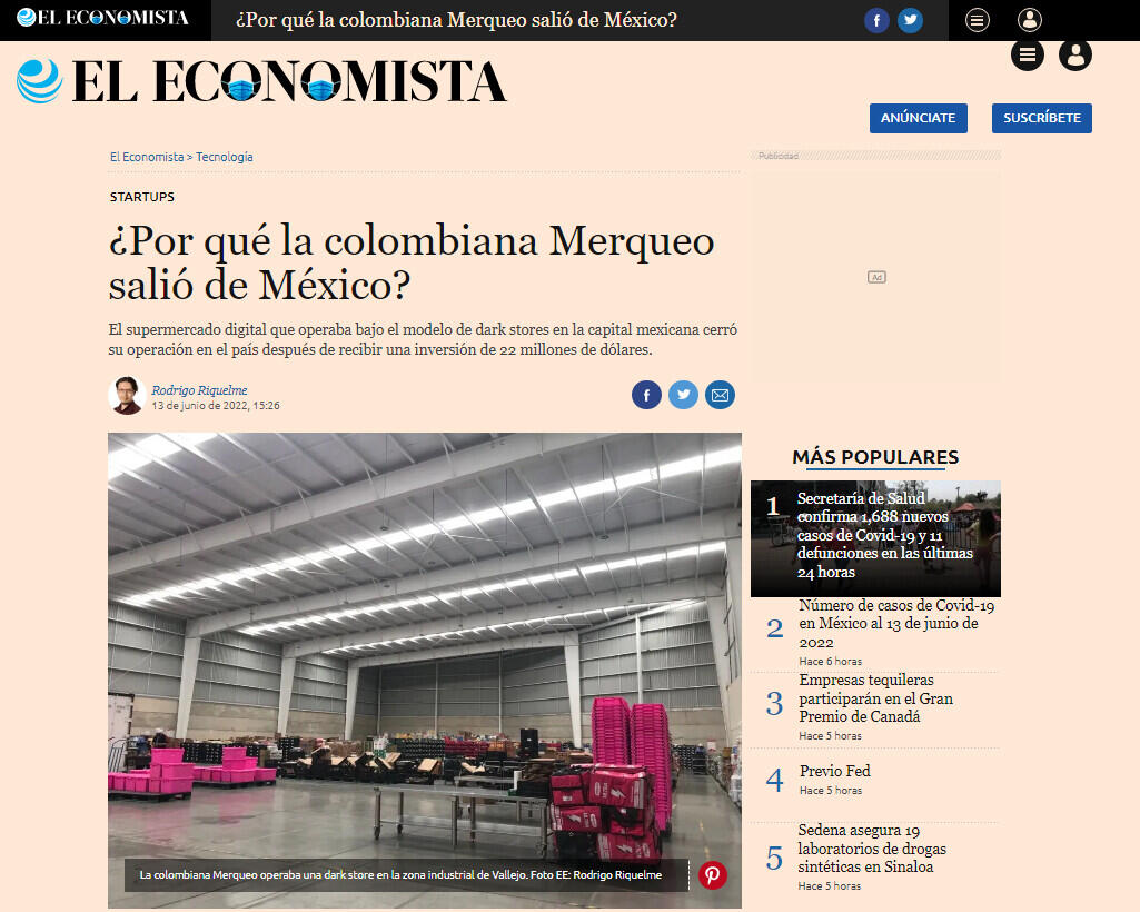 El supermercado en línea de origen colombiano Merqueo cerró sus operaciones en México el 8 de junio pasado, después de haber anunciado apenas en abril pasado que sus ventas totales durante el 2021 en el país crecieron 10 veces. La compañía recibió un financiamiento por 22 millones de dólares por parte de BID Invest en mayo.