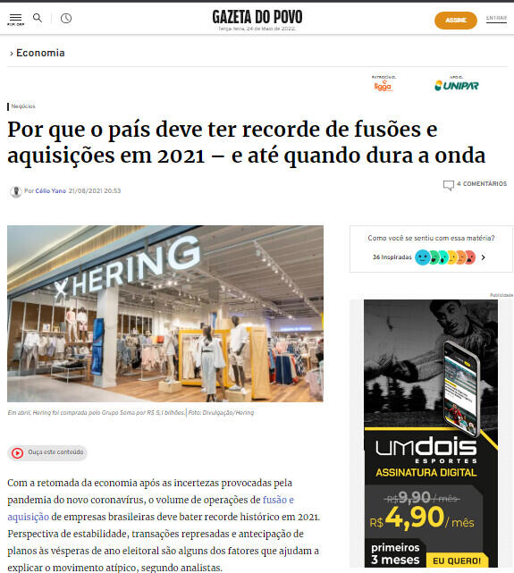 Entre os grandes negócios estão a compra da Hering pelo Grupo Soma, pelo valor de R$ 5,1 bilhões, após uma disputa com a Arezzo, e a fusão da Hapvida e da NotreDame Intermédica, as duas maiores operadora de plano de saúde do país.