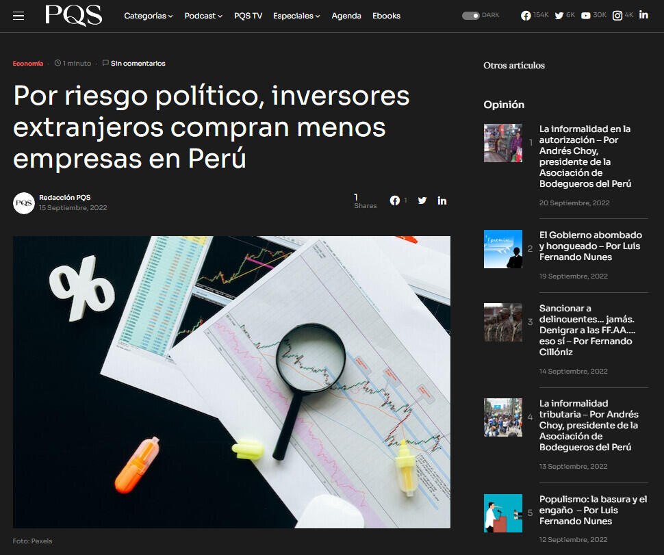 “Esto eleva el riesgo país de Perú y reduce la valoración de sus empresas, por eso se registra una menor cantidad de este tipo de operaciones, debido a la mayor cautela de los inversionistas”, subrayó.
