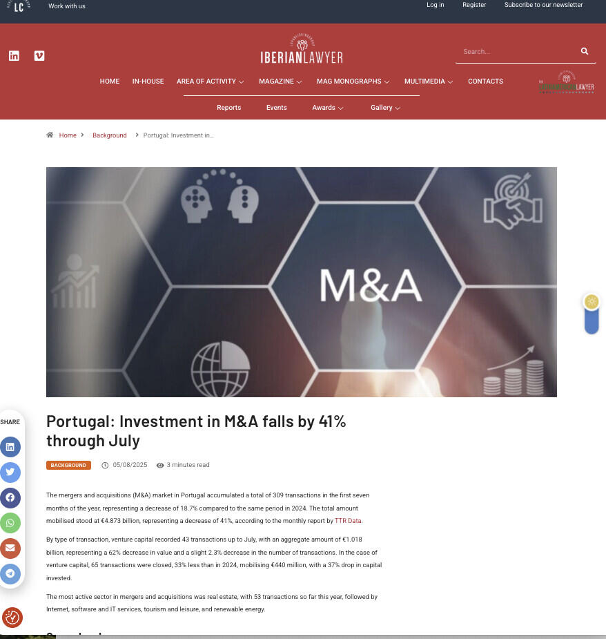 The mergers and acquisitions (M&A) market in Portugal accumulated a total of 309 transactions in the first seven months of the year, representing a decrease of 18.7% compared to the same period in 2024. The total amount mobilised stood at €4.873 billion, representing a decrease of 41%, according to the monthly report by TTR Data.