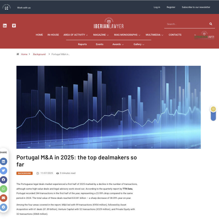 The Portuguese legal deals market experienced a first half of 2025 marked by a decline in the number of transactions, although some high-value deals and legal advisory work stood out. According to the quarterly report by TTR Data, Portugal recorded 244 transactions in the first half of the year, representing a 23.99% drop compared to the same period in 2024. The total value of these deals reached €4.041 billion — a sharp decrease of 38.09% year-on-year.