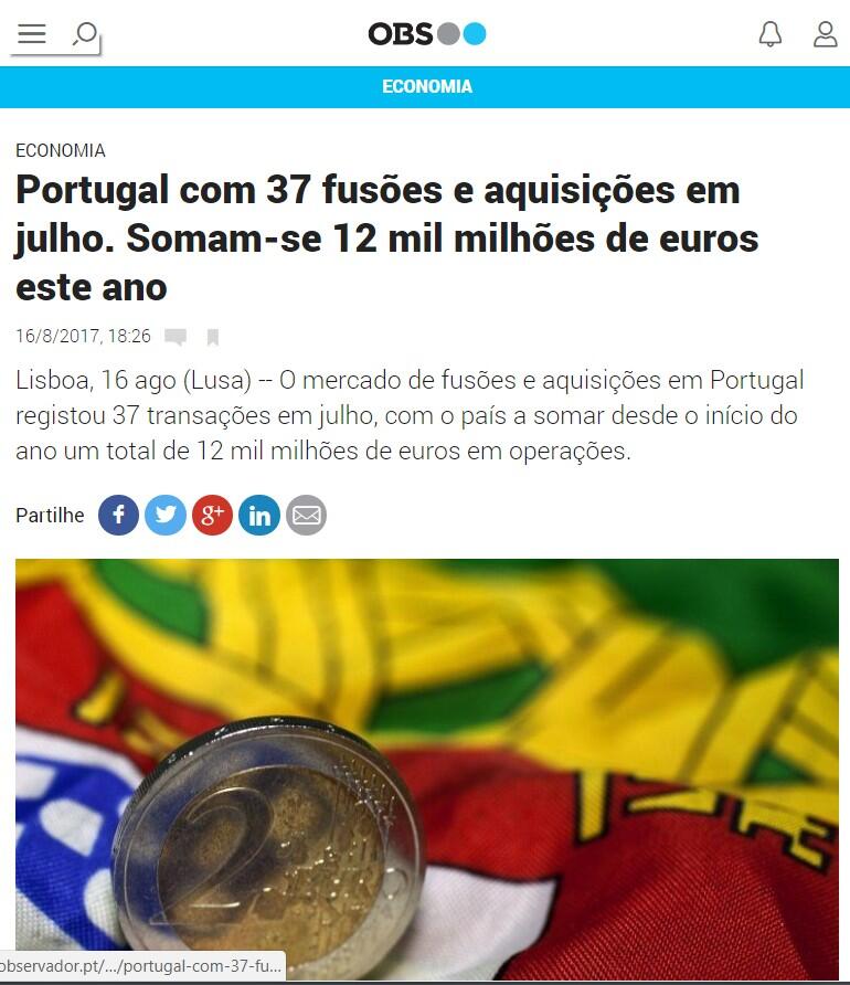 Segundo dados divulgados no relatório mensal de M&A da Transactional Track Record, “de janeiro a julho de 2017, Portugal já soma 214 operações e valor total de 12 mil milhões de euros, um expressivo crescimento de 240% em relação ao mesmo período do ano passado”.
