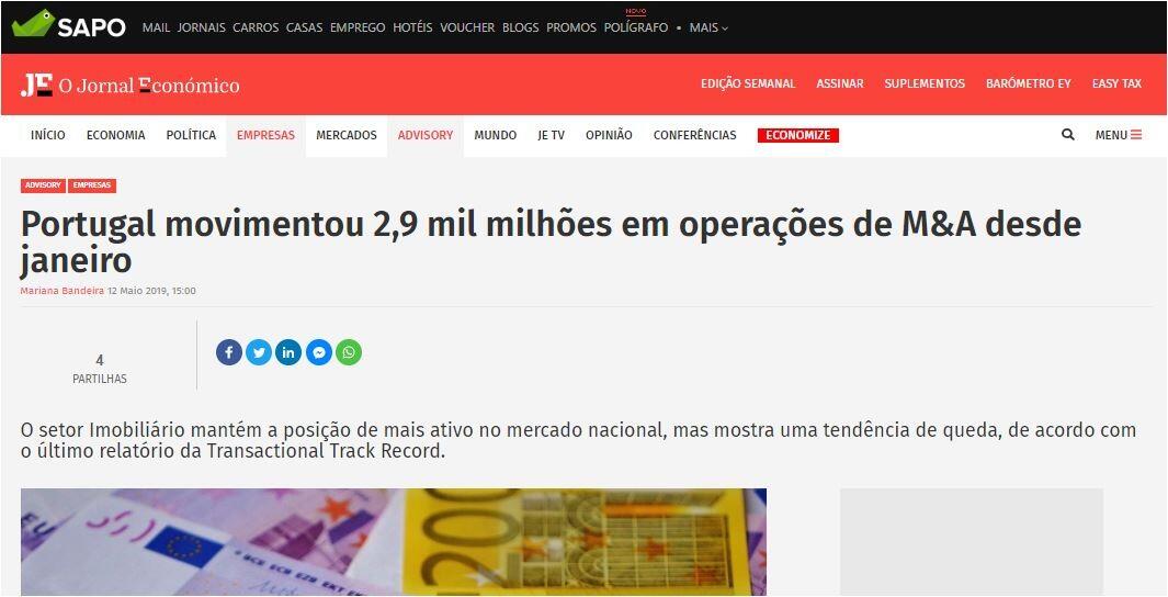 Portugal movimentou 2,9 mil milhões em operações de M&A desde janeiro