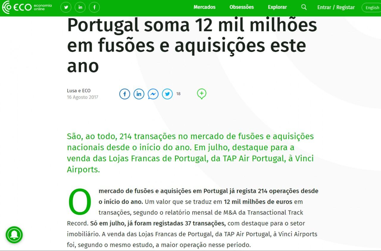 Omercado de fusões e aquisições em Portugal já regista 214 operações desde o início do ano. Um valor que se traduz em 12 mil milhões de eurosem transações, segundo o relatório mensal de M&A da Transactional Track Record. Só em julho, já foram registadas 37 transações, com destaque para o setor imobiliário. A venda das Lojas Francas de Portugal, da TAP Air Portugal, à Vinci Airports foi, segundo o mesmo estudo, a maior operação nesse período.