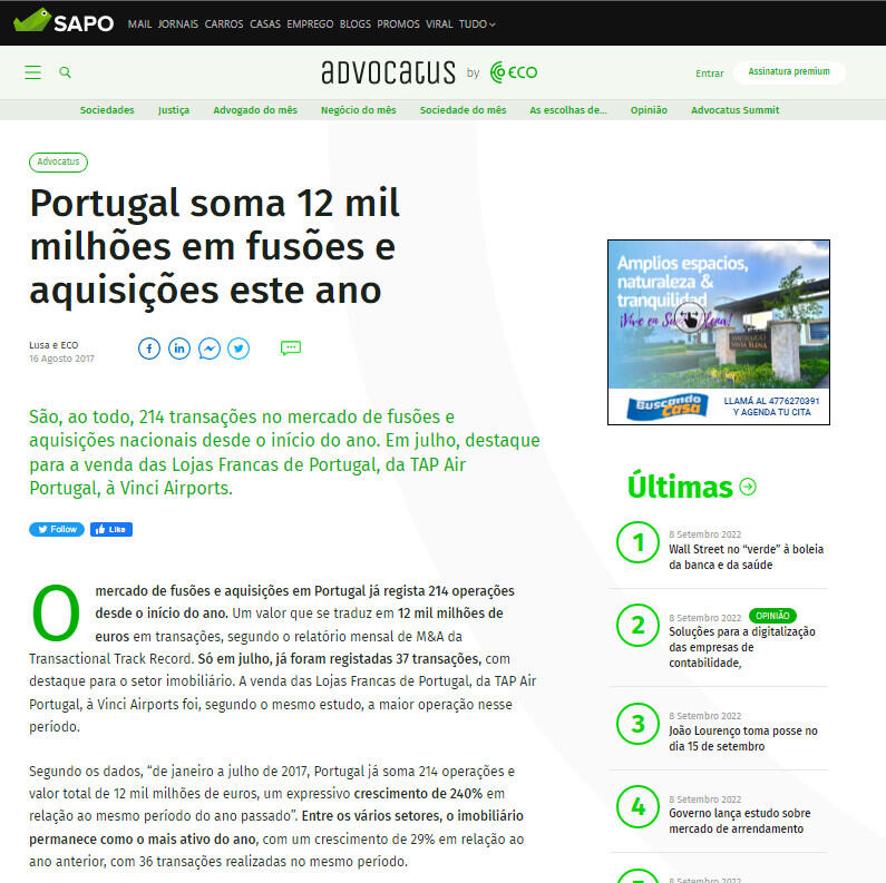 O mercado de fusões e aquisições em Portugal já regista 214 operações desde o início do ano. Um valor que se traduz em 12 mil milhões de euros em transações, segundo o relatório mensal de M&A da Transactional Track Record. Só em julho, já foram registadas 37 transações, com destaque para o setor imobiliário. A venda das Lojas Francas de Portugal, da TAP Air Portugal, à Vinci Airports foi, segundo o mesmo estudo, a maior operação nesse período.