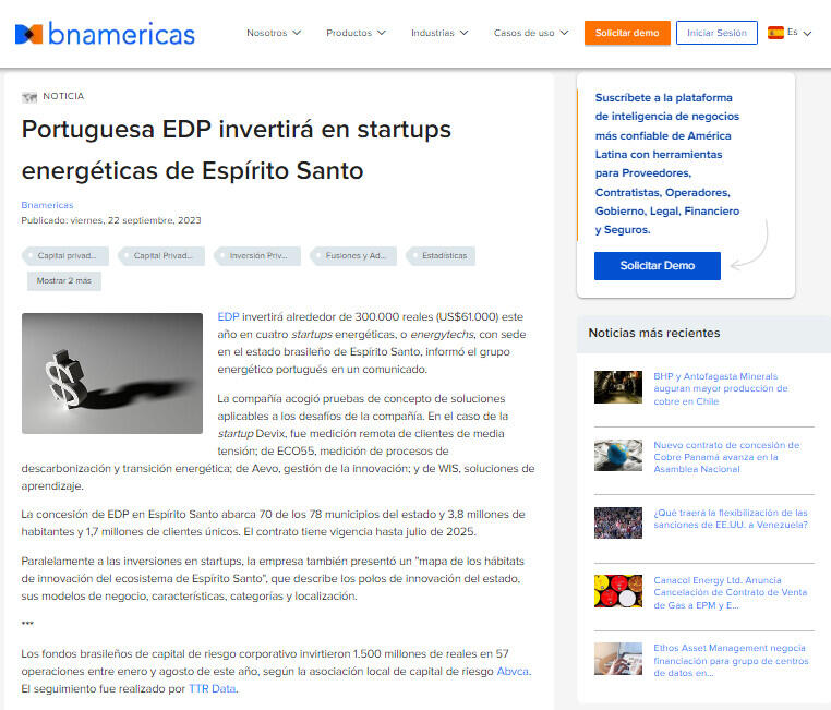 EDP invertirá alrededor de 300.000 reales (US$61.000) este año en cuatro startups energéticas, o energytechs, con sede en el estado brasileño de Espírito Santo, informó el grupo energético portugués en un comunicado.