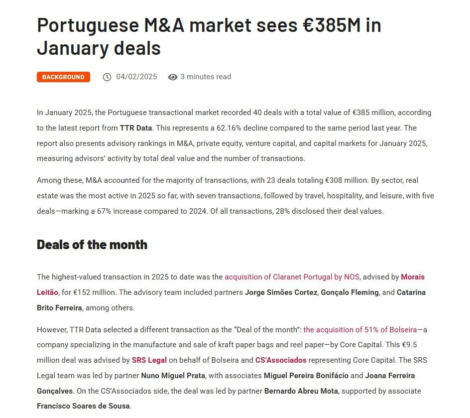 However, TTR Data selected a different transaction as the “Deal of the month”: the acquisition of 51% of Bolseira—a company specializing in the manufacture and sale of kraft paper bags and reel paper—by Core Capital. This €9.5 million deal was advised by SRS Legal on behalf of Bolseira and CS’Associados representing Core Capital. The SRS Legal team was led by partner Nuno Miguel Prata, with associates Miguel Pereira Bonifácio and Joana Ferreira Gonçalves. On the CS’Associados side, the deal was led by partner Bernardo Abreu Mota, supported by associate Francisco Soares de Sousa.