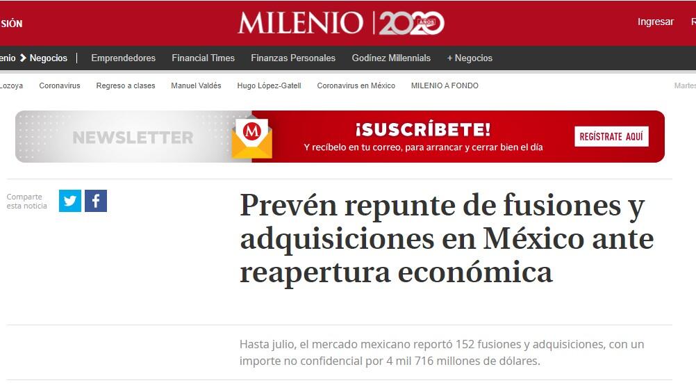 Pese a que al inicio del confinamiento por el corornavirus en México se vislumbró una baja importante en el mercado de fusiones y adquisiciones (M&A, por su sigla en inglés), especialistas del sector afirman que se espera que este tenga un repunte, de la mano de la reactivación económica del país.