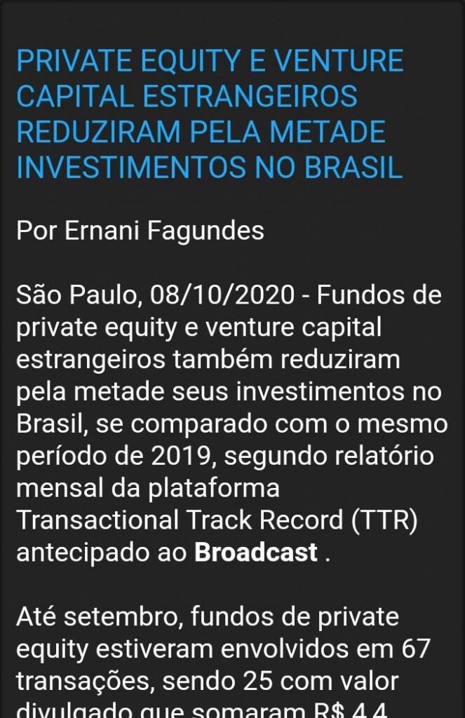 Fundos de private equity e venture capital estrangeiros também reduziram pela metade seus investimentos no Brasil, se comparado com o mesmo período de 2019, segundo relatório mensal da plataforma Transactional Track Record (TTR) antecipado ao Broadcast .