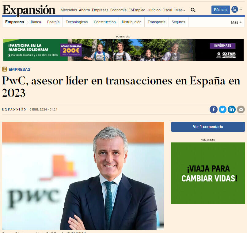 PwC, asesor líder en transacciones en España en 2023