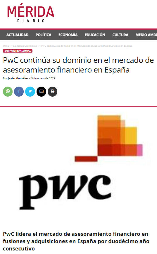 PwC lidera el mercado de asesoramiento financiero en fusiones y adquisiciones en España por duodécimo año consecutivo