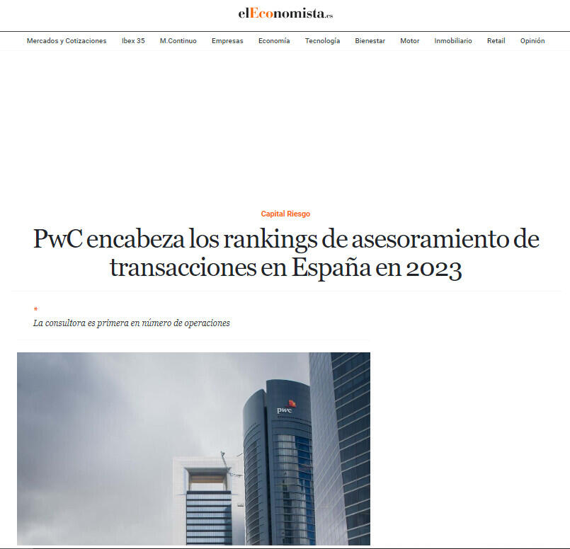 PwC encabeza los rankings de asesoramiento de transacciones en Espaņa en 2023