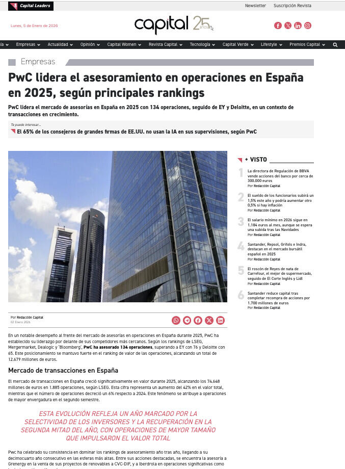 En un notable desempeño al frente del mercado de asesorías en operaciones en España durante 2025, PwC ha establecido su liderazgo por delante de sus competidores más cercanos. Según los rankings de LSEG, Mergermarket, Dealogic y ‘Bloomberg’, PwC ha asesorado 134 operaciones, superando a EY con 76 y Deloitte con 65. Este posicionamiento se mantuvo fuerte en el ranking de valor de las operaciones, alcanzando un total de 12.679 millones de euros.
