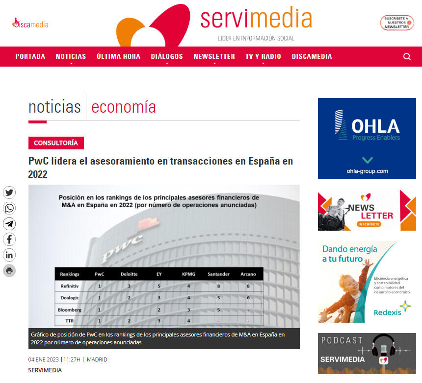 PwC lidera el asesoramiento en transacciones en Espaņa en 2022