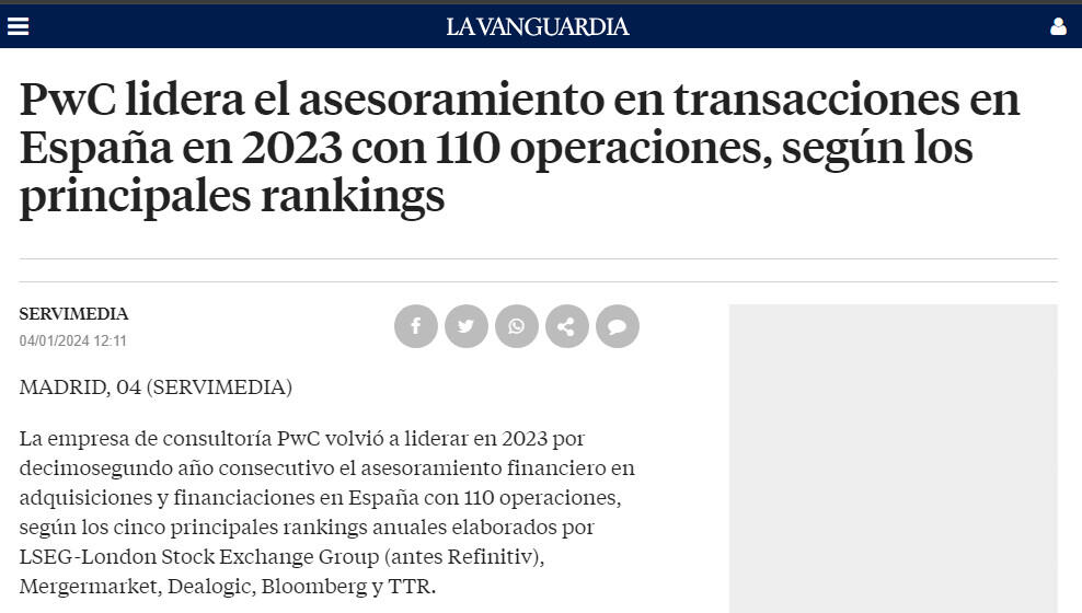 PwC lidera el asesoramiento en transacciones en España en 2023 con 110 operaciones, según los principales rankings