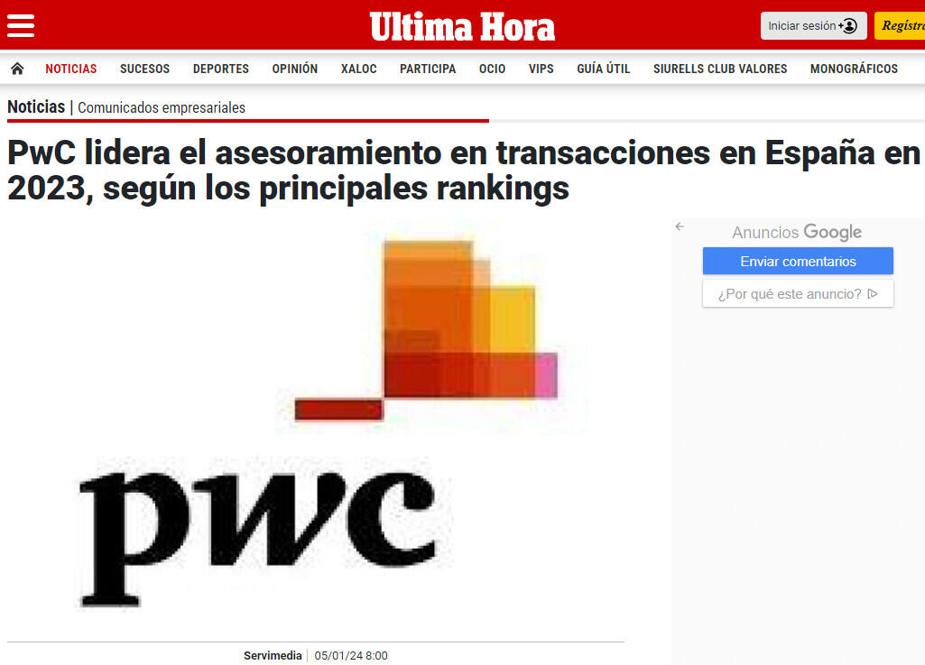 PwC lidera el asesoramiento en transacciones en España en 2023, según los principales rankings