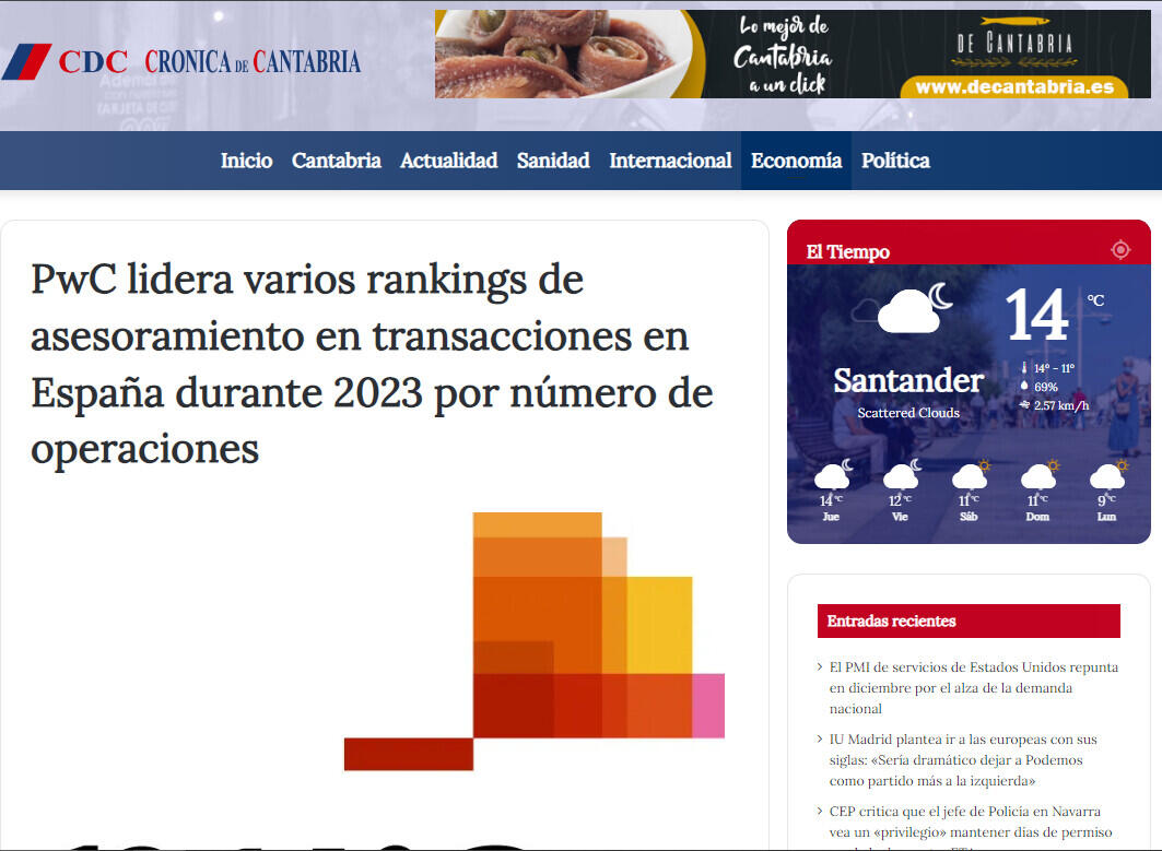 PwC lidera varios rankings de asesoramiento en transacciones en España durante 2023 por número de operaciones