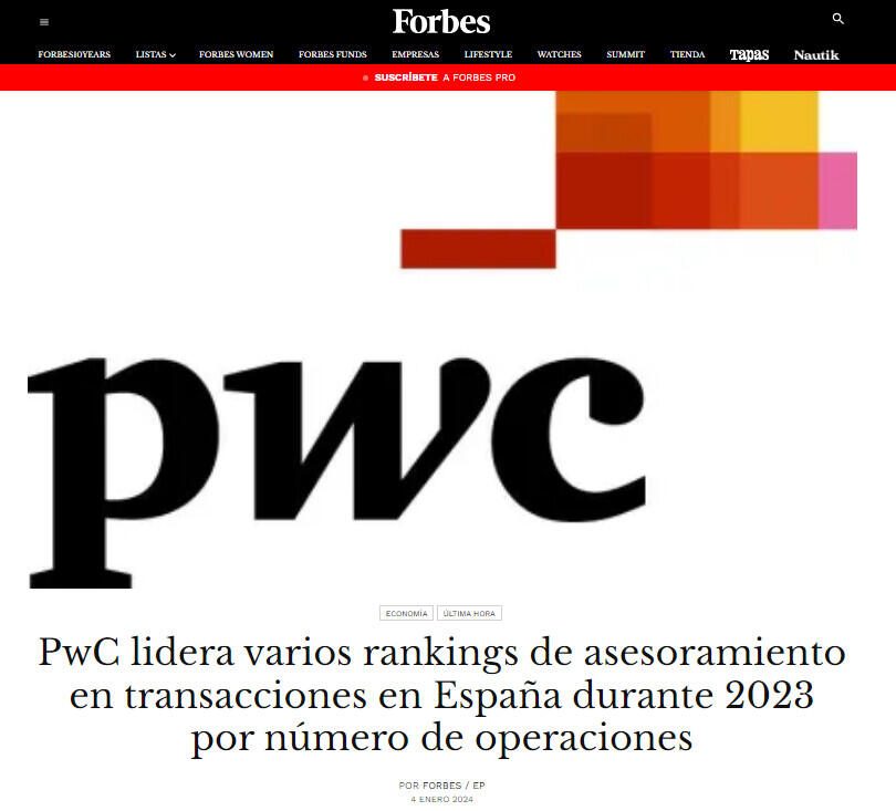 PwC lidera varios rankings de asesoramiento en transacciones en España durante 2023 por número de operaciones