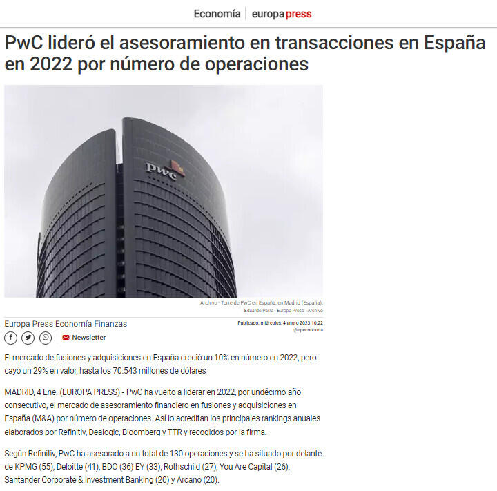 MADRID, 4 Ene. (EUROPA PRESS) - PwC ha vuelto a liderar en 2022, por undécimo año consecutivo, el mercado de asesoramiento financiero en fusiones y adquisiciones en España (M&A) por número de operaciones. Así lo acreditan los principales rankings anuales elaborados por Refinitiv, Dealogic, Bloomberg y TTR y recogidos por la firma, además de por Europa Press.