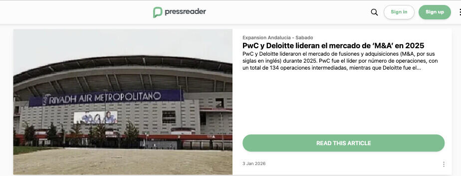 PwC y Deloitte lideraron el mercado de fusiones y adquisiciones (M&A, por sus siglas en inglés) durante 2025. PwC fue el líder por número de operaciones, con un total de 134 operaciones intermediadas, mientras que Deloitte fue el número uno del ránking en términos de valor, con transacciones intermediadas por valor de 7.035 millones de euros, según los datos de LSEG (Refinitiv).