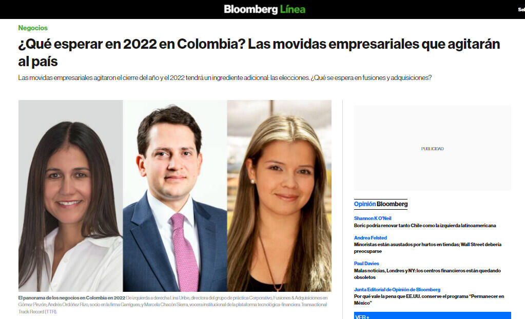 La vocera institucional de la plataforma tecnológica-financiera Transactional Track Record (TTR), Marcela Chacón Sierra, coincide en una entrevista con Bloomberg Línea que las operaciones de gran monto podrían registrar una tendencia moderada en el mediano plazo debido a los efectos de la coyuntura preelectoral 2022, así como las respuestas de política monetaria y fiscal que se implementen y que faciliten el proceso de recuperación económica en el ámbito local.
