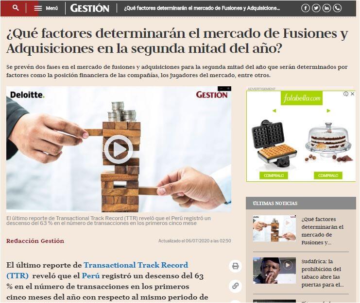 El último reporte de Transactional Track Record (TTR) reveló que el Perú registró un descenso del 63 % en el número de transacciones en los primeros cinco meses del año con respecto al mismo periodo de 2019, y una retracción de 76% en términos de valor.
