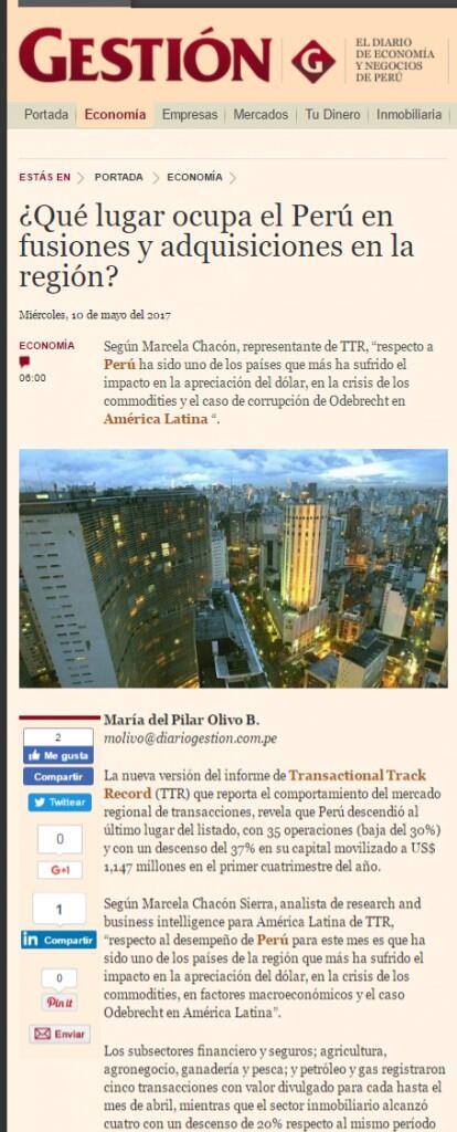 La nueva versión del informe de Transactional Track Record (TTR) que reporta el comportamiento del mercado regional de transacciones, revela que Perú descendió al último lugar del listado, con 35 operaciones (baja del 30%) y con un descenso del 37% en su capital movilizado a US$ 1,147 millones en el primer cuatrimestre del año.